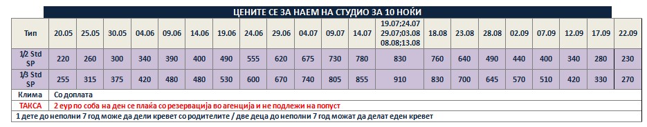 Такса за престој, во висина од 2 еврa по сместувачка единица на ден се плаќа во агенција со резервација и не подлежи на попусти!