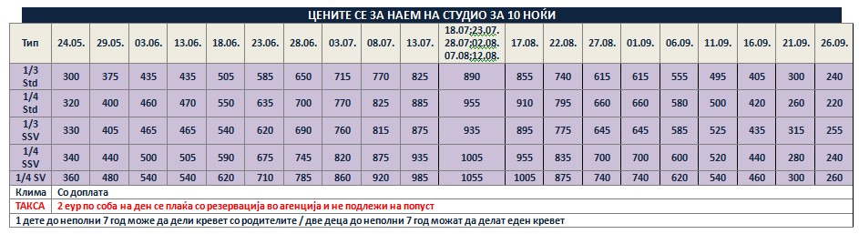 Такса за престој, во висина од 2 еврa по сместувачка единица на ден се плаќа во агенција со резервација и не подлежи на попусти!