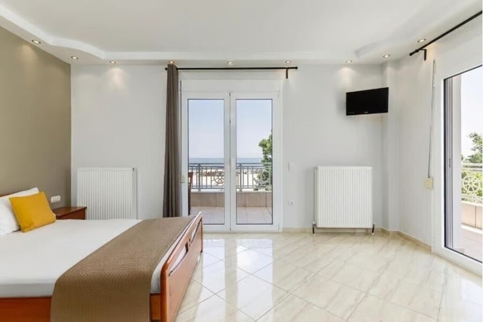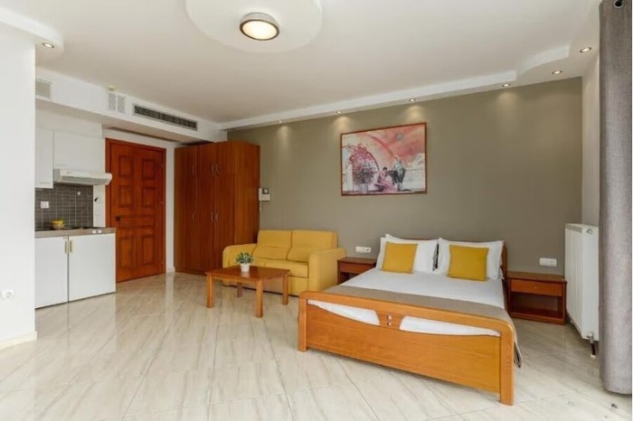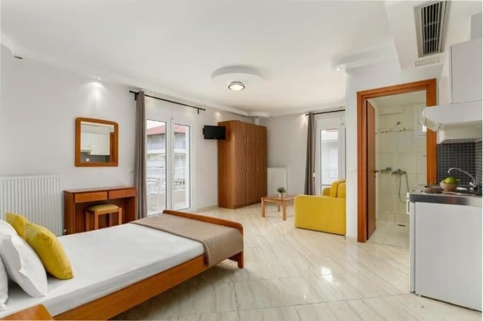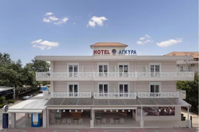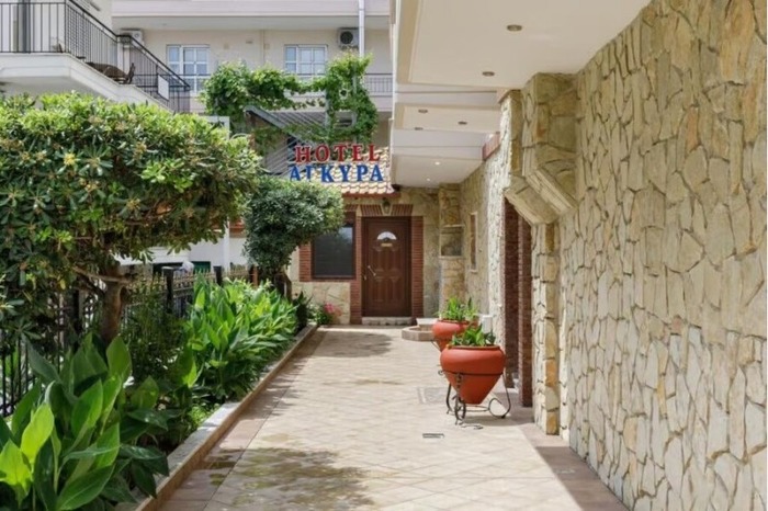 Agyra се наоѓа на самиот морски брег во Неи Пори, наспроти песочната плажа. Располага со убаво уредени трокреветни и четворокреветни студија, кои се сместени на прв и втор кат. Студијата се комфорни и покрај дуплиот кревет имаат софа на расклопување (со широчина околу 130 cm). Сите студија имаат основно опремена кујна, купатило, тераса, ТВ и централно ладење, кое се доплаќа дополнително, на лице место. Објектот поседува лифт. Замена на постелнината и пешкирите е на половина од престојот. Објектот е покриен со бежичен интернет, за чија брзина агенцијата не може да гарантира. Поголем број на студијата се со страничен или директен поглед на море.