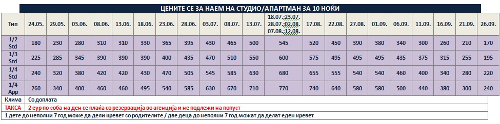 Такса за престој, во висина од 2 еврa по сместувачка единица на ден се плаќа во агенција со резервација и не подлежи на попусти!