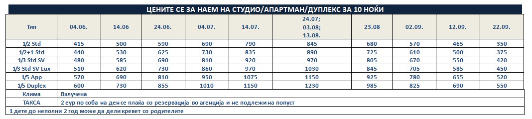 Такса за престој, во висина од 2 еврa по сместувачка единица на ден се плаќа во агенција со резервација и не подлежи на попусти!