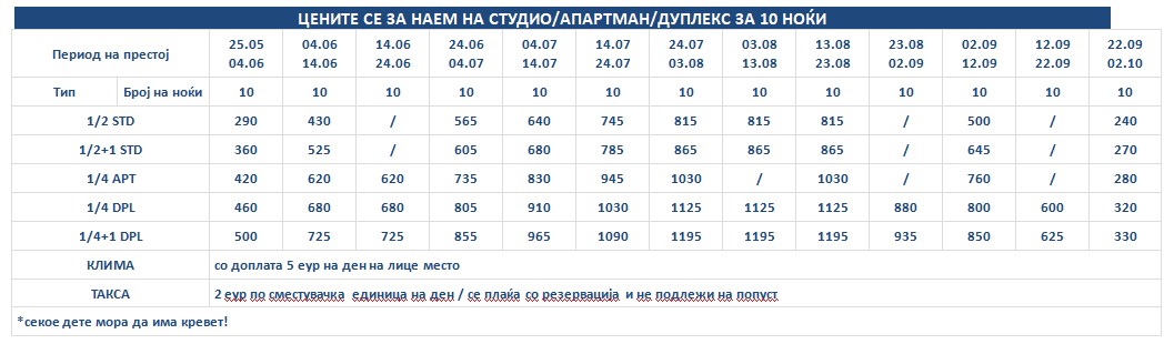 Такса за престој, во висина од 2 еврa по сместувачка единица на ден се плаќа во агенција со резервација и не подлежи на попусти!
