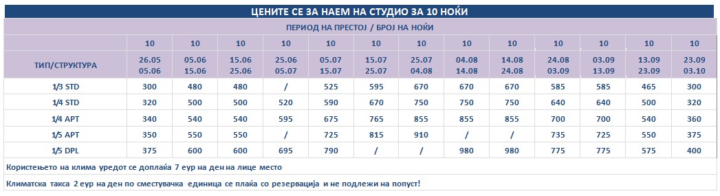 Такса за престој, во висина од 2 еврa по сместувачка единица на ден се плаќа во агенција со резервација и не подлежи на попусти!