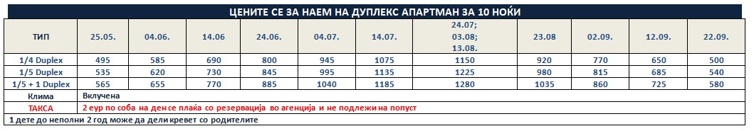 Такса за престој, во висина од 2 еврa по сместувачка единица на ден се плаќа во агенција со резервација и не подлежи на попусти!