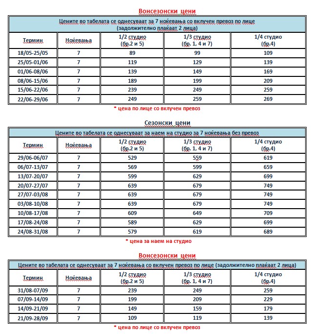 • ЦЕНИТЕ ВО ТАБЕЛА БР.2 – СЕЗОНСКИ СЕ ДАДЕНИ ЗА НАЕМ НА СТУДИО ЗА 7 НОЌЕВАЊА, според бројот на кревети во секоја соба, без вклучен превоз, а истиот се доплаќа: