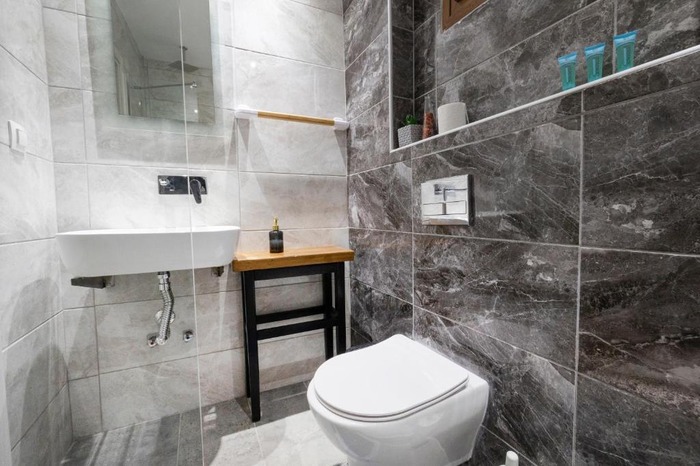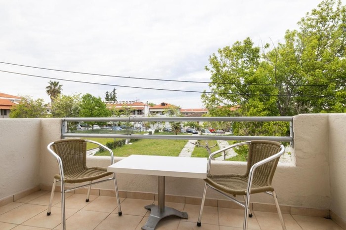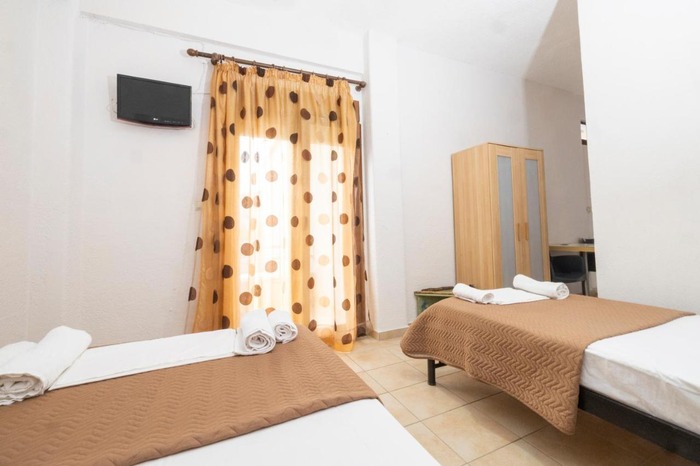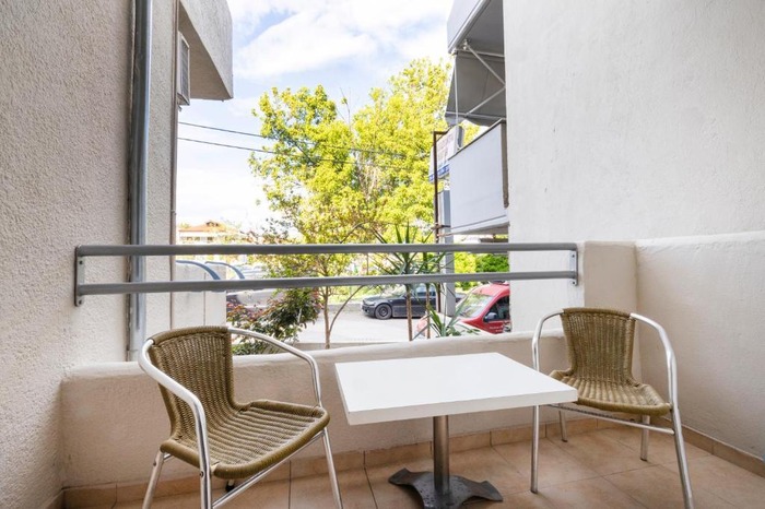 Студио бр. 5 – прв кат. Располага со комплетно опремена кујна со голем фрижидер и мало решо, комплетно реновиран тоалет, сопствена тераса опремена со маса и столови и поглед кон парк, клима, ТВ, Wi-Fi. Има брачен кревет.