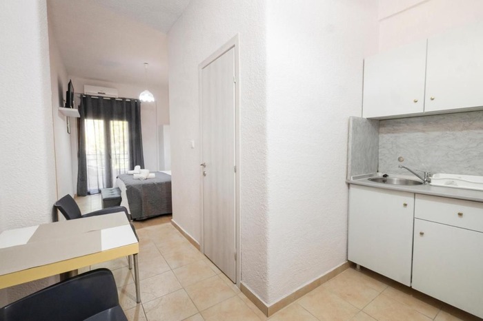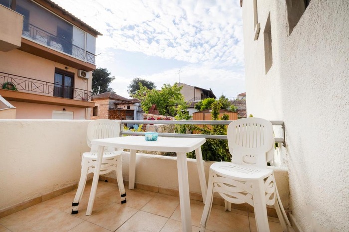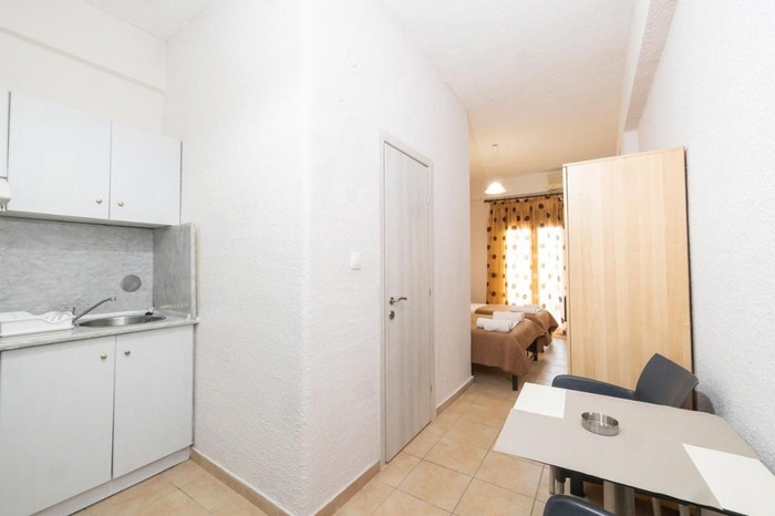 Студио бр. 1 – високо приземје. Располага со комплетно опремена кујна со голем фрижидер и мало решо, комплетно реновиран тоалет, сопствена тераса опремена со маса и столови и поглед кон парк, клима, ТВ, Wi-Fi. Има француски кревет и еден стандарден кревет.