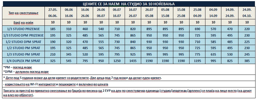 – За хигиената во сместувачката единица се грижат гостите. Евентуална неисправност и недостаток во сместувачките единици гостинот е должен да ја пријави на претставникот на агенцијата организатор. Секоја направена штета гостинот е должен да му ја надомести на сопственикот на објектот пред напуштање на истиот. При влез во сместувачката единица гостинот е должен да го преконтролира инвентарот и секој недостаток да го пријави на претставникот или на сопственикот. Секое оштетување кое постоело во студиото/апартманот пред влезот, а не било пријавено, ќе се третира како штета предизвикана од гостите кои во моментот престојуваат во објектот. Гостите се должни да го почитуваат куќниот ред на објектот, во спротивно сопственикот има право да им го скрати правото на престој, а организаторот нема да ја преземе одговорноста за тоа нити е должен да ги обештети гостите за неискористениот дел од услугата.