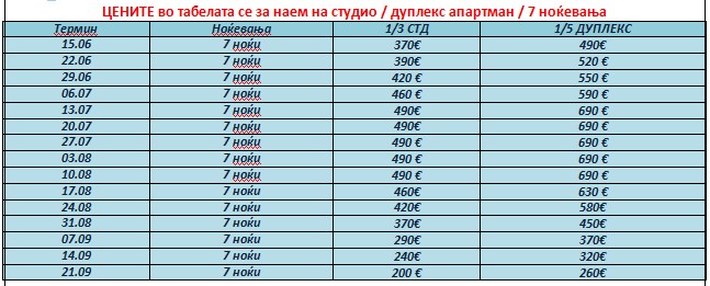 ЦЕНИТЕ во табелата се дадени за наем на студио или апартман за 7 ноќевања.