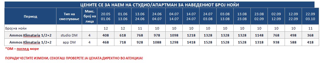 -Во објектите каде што користење на клима уредот е со доплата на лице место, цената се движи од 6-10 еур на ден по уред. Истатата е променлива и не предмет на договор помеѓу агенцијата и сопственикот.
