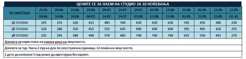 Такса за престој, во висина од 2 евро по сместувачка единица на ден се плаќа на лице место, на претставникот или сопствениците на објектот и не подлежи на попусти!