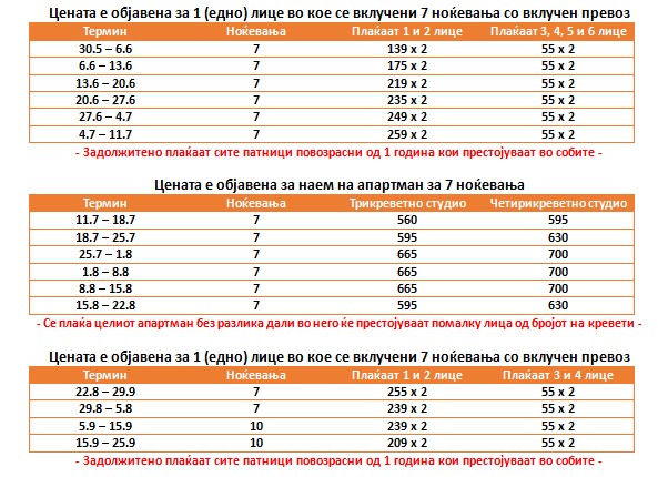 – Цените во табелите 1 и 3 се објавени за 1 (едно) лице за 7 ноќевања со вклучен автобуски превоз. Доплатата за 3 и 4 лице (во зависност од бројот на кревети) е задолжителна, плаќаат сите лица кои престојуваат а кои се повозрасни од 1 година.