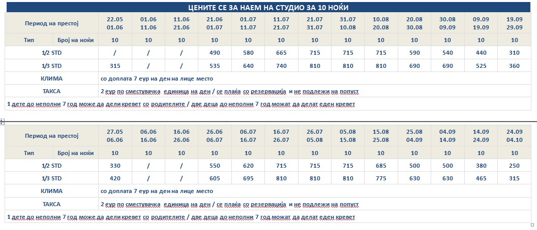Такса за престој, во висина од 2 еврa по сместувачка единица на ден се плаќа во агенција со резервација и не подлежи на попусти!