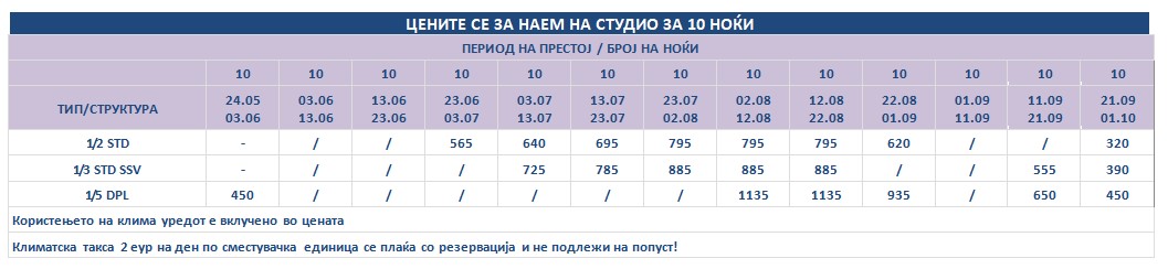 Такса за престој, во висина од 2 еврa по сместувачка единица на ден се плаќа во агенција со резервација и не подлежи на попусти!