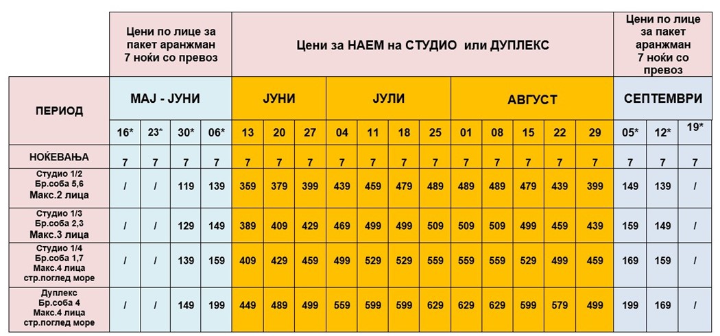 – трето, четврто или петто лице се сместуваат бесплатно, доплаќаат само превоз доколку користат – 50€ за возрасен или 35€ за дете од 02 – 12 години;