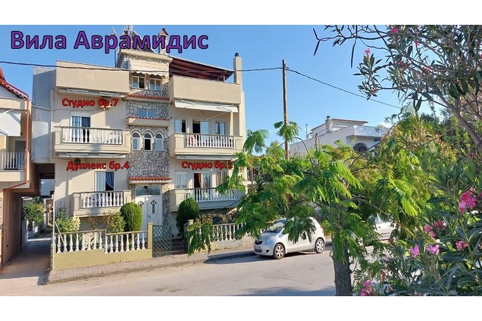 АВРАМИДИС е убава, стандардно опремена куќа и се наоѓа на 80 метри од плажа. Секое студио и апартман имаат кујна, стандардно опремена со кујнски инвентар, голем фрижидер, решо со две рингли, купатило и вц, спална соба, тераса, тв, клима уред и ви-фи конекција. КОРИСТЕЊЕТО НА ПАРКИНГ, КЛИМА УРЕДОТ, WI-FI Е БЕСПЛАТНО. КУЌАТА ИМА ПАРКИНГ (ГОЛЕМ) И ГОСТИТЕ ГО КОРИСТАТ ПО ПРИНЦИП ПРВО СЛОБОДНО МЕСТО.