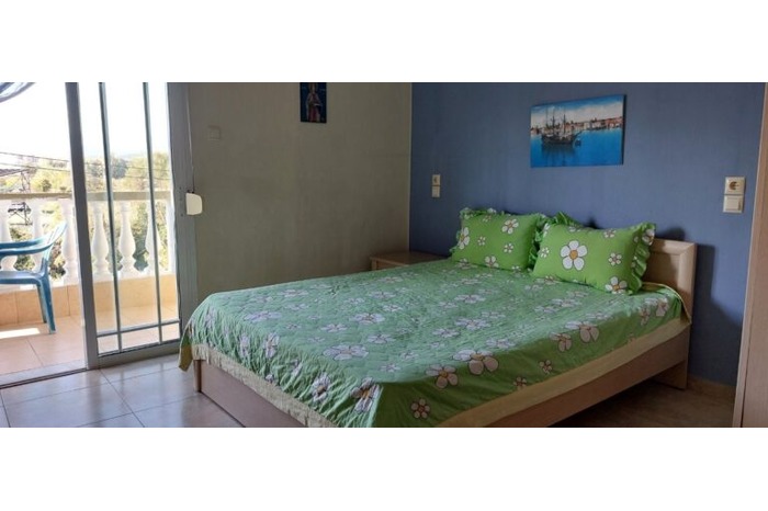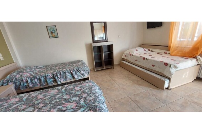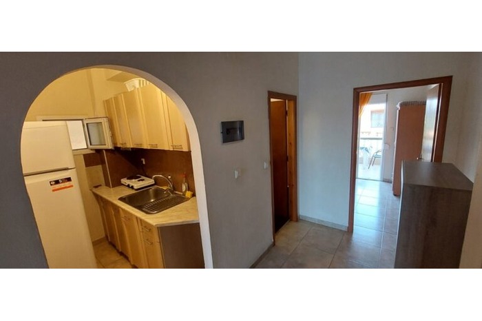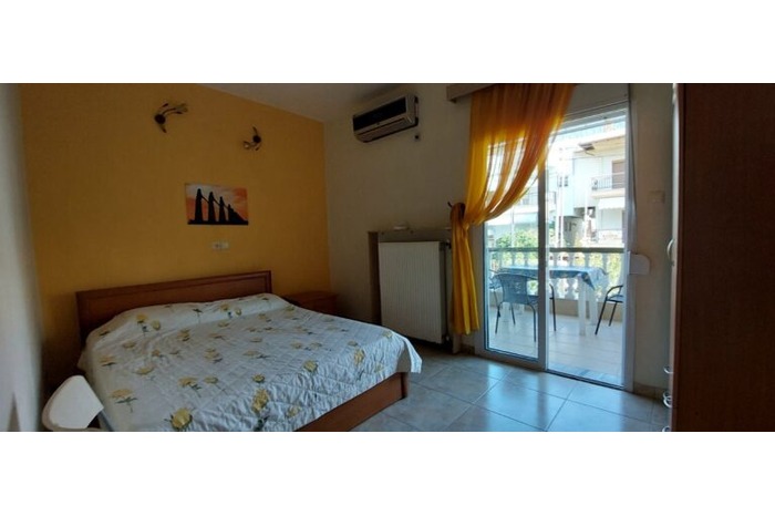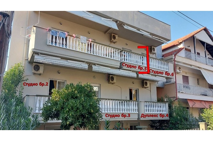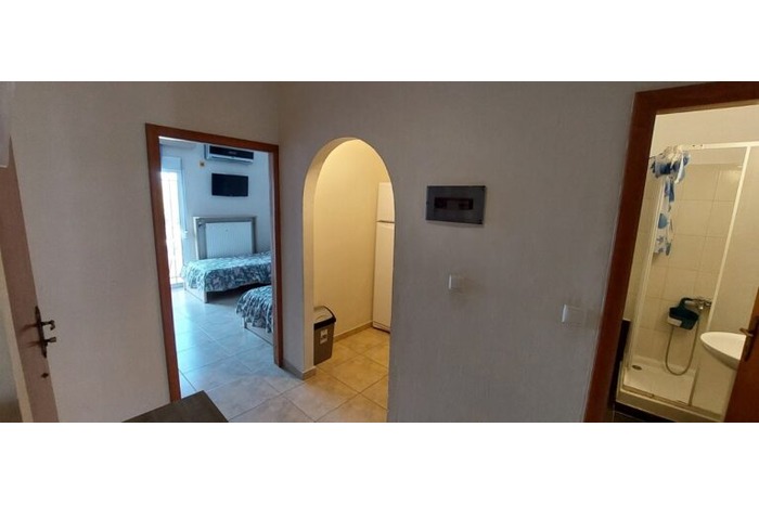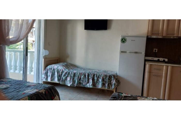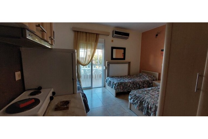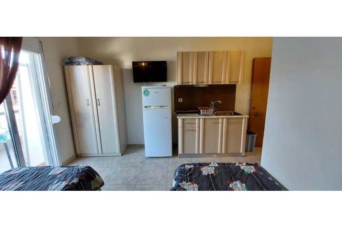 Студиото располага со три стандардни единечни кревети, плакар за алишта, тв, клима уред. Во склопот на истата соба е кујна, опремена со кујнски инвентар, голем фрижидер, решо со две рингли. Од собата се излегува на комотна тераса со маса и столици. Студиото располага со стандардно купатило и вц.