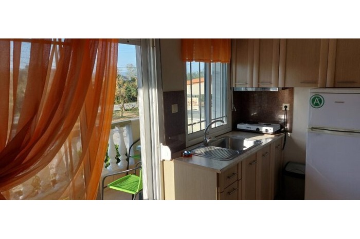 Студиото располага со два единечни стандардни кревети и еден единечен кревет со кревет на извлекување под него. Вкупно во студиото можат да престојуваат четири лица. Во склопот на истата соба е кујна, опремена со кујнски инвентар, голем фрижидер, решо со две рингли, плакар за алишта, тв, клима уред. Од собата се излегува на комотна тераса со маса и столици и има страничен поглед на море. Студиото располага со стандардно купатило и вц.