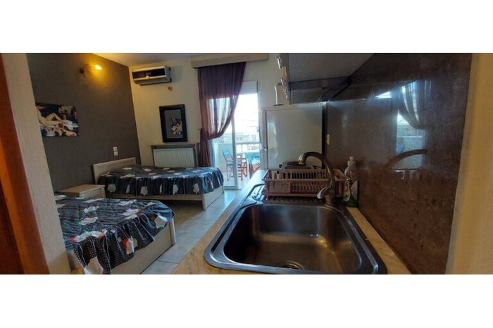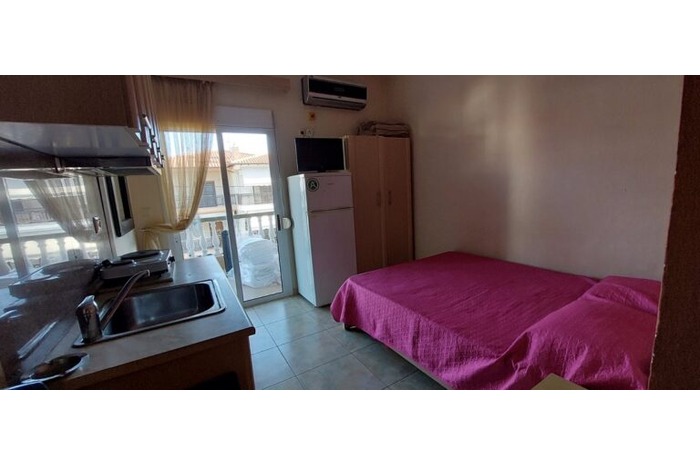 Студиото располага со два единечни кревети стандардни за спиење и еден единечен кревет со кревет на извлекување под него. Вкупно во студиото можат да престојуваат четири лица. Во склопот на истата соба е кујна опремена со кујнски инвентар, голем фрижидер, решо со две рингли, плакар за алишта, тв, клима уред. Од собата се излегува на комотна тераса со маса и столици и има страничен поглед на море. Студиото располага со стандардно купатило и вц.