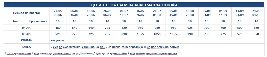 Такса за престој, во висина од 2 еврa по сместувачка единица на ден се плаќа во агенција со резервација и не подлежи на попусти!