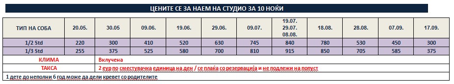 Такса за престој, во висина од 2 евра по сместувачка единица на ден се плаќа во агенција со резервација и не подлежи на попусти!