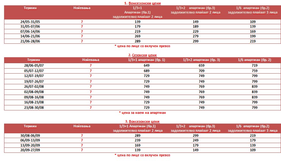 • ЦЕНИТЕ ВО ТАБЕЛА БР.2 – СЕЗОНСКИ СЕ ДАДЕНИ ЗА НАЕМ НА АПАРТМАН ЗА 7 НОЌЕВАЊА, според бројот на кревети во секоја соба, без вклучен превоз, а истиот се доплаќа:
