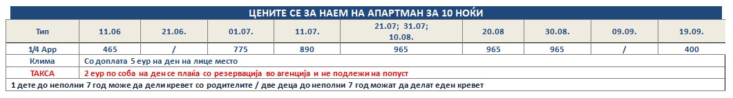Такса за престој, во висина од 2 евро по сместувачка единица на ден се плаќа во агенција со резервација и не подлежи на попусти!