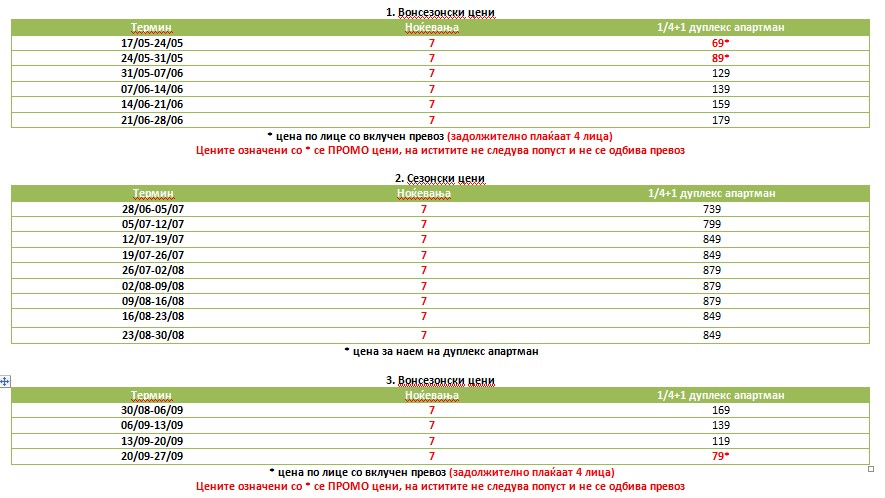 • ЦЕНИТЕ ВО ТАБЕЛА БР.1 и 3 – ВОНСЕЗОНСКИ СЕ ДАДЕНИ ПО ЛИЦЕ ЗА ПАКЕТ АРАНЖМАН – 7 НОЌЕВАЊА СО ВКЛУЧЕН ПРЕВОЗ.