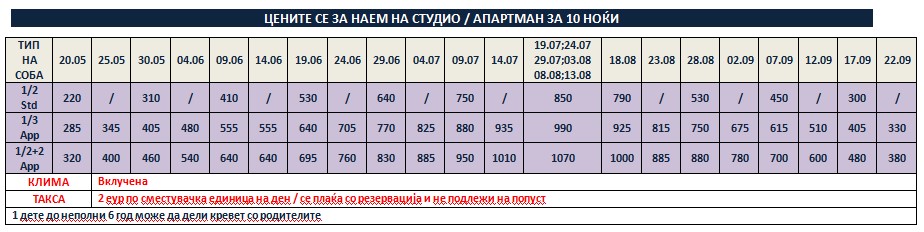 Такса за престој, во висина од 2 евра по сместувачка единица на ден се плаќа во агенција со резервација и не подлежи на попусти!