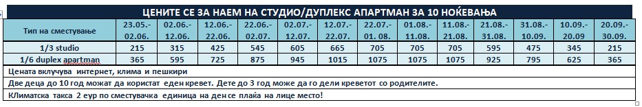 Такса за престој, во висина од 2 еврa по сместувачка единица на ден се плаќа на лице место, на претставникот или сопствениците на објектот и не подлежи на попусти!