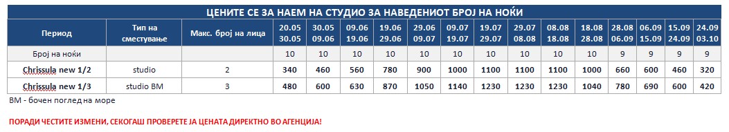 CHRISULA NEW– Сместена е во непосредна близина на плажата. Студијата имаат SAT TV, бежичен интернет, за чија брзина агенцијата не може да гарантира и клима уред, чије користење е вклучено во цената. Две студија се со поглед кон улица, a две со страничен поглед кон морето. Заради позицијата ова е една од најбараните куќи. На 20 m oд куќата е песочен дел на плажата, a на околу 120 m се наоѓа карпесто-песочен дел познат по ресторанот “Vrahakia” (vrahaki-карпа).