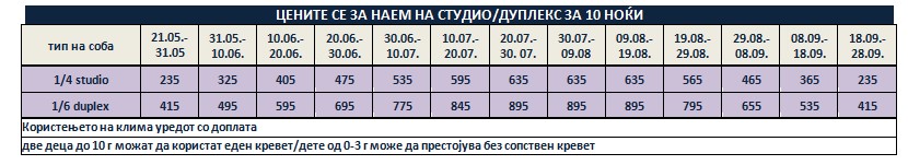 Такса за престој, во висина од 2 еврa по сместувачка единица на ден се плаќа на лице место, на претставникот или сопствениците на објектот и не подлежи на попусти!