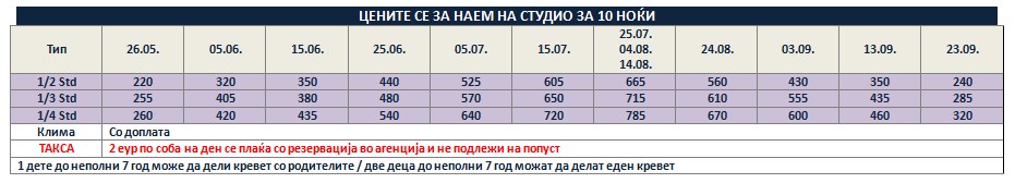 Такса за престој, во висина од 2 еврa по сместувачка единица на ден се плаќа во агенција со резервација и не подлежи на попусти!