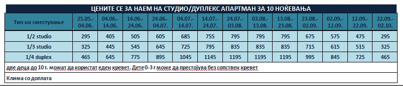 СОДРЖИНА НА ДУПЛЕКСИТЕ: чајна кујна со садови и прибор, фрижидер, клима, купатило, тераса, TV, гарнитура за седење на балкон, решо