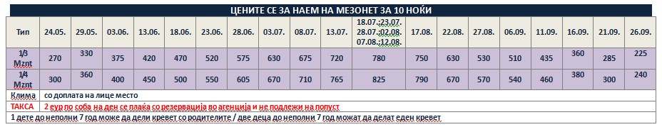 Такса за престој, во висина од 2 еврa по сместувачка единица на ден се плаќа во агенција со резервација и не подлежи на попусти!