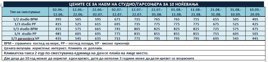 • На дополнителните услуги (доплата за клима, полупансион и сл.), наведени во ценовникот, не се пресметуваат попусти.