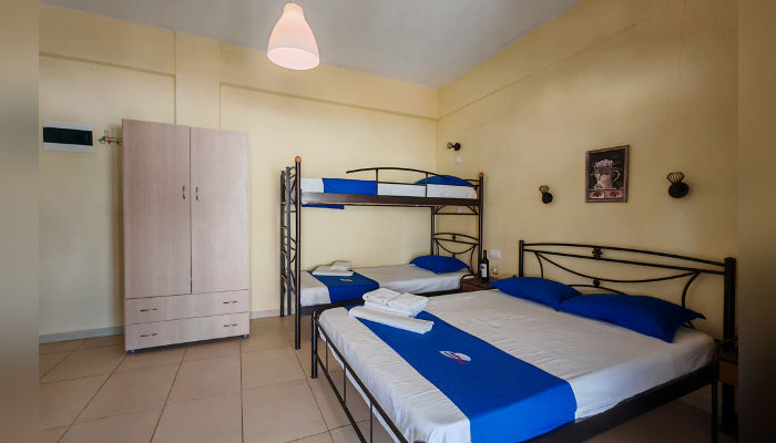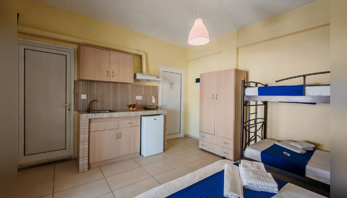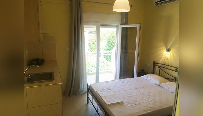 Dina House се наоѓа во мирниот, стар дел на Сарти на 60 m oд морето и на само неколку чекори од шеталиштето. Целосно е реновирана во 2017 година. Студијата се наоѓаат на прв кат. Сите имаат телевизор, бесплатен бежичен интернет, за чија брзина агенцијата не може да гарантира и клима уред чие користење е вклучено во цената. Студиото бр. 4 има своја, но издвоена тераса и затоа има пониска цена. Сите студија имаат мал фрижидер, решо, комарници, купатила со озидана туш-када, пешкири, пространи тераси со поглед на улица. Освен двокреветното студио кое има француски кревет и е малку потесно, останатите имаат француски кревет и кревети на кат.
