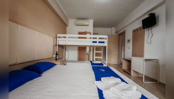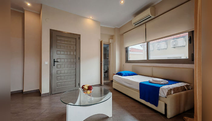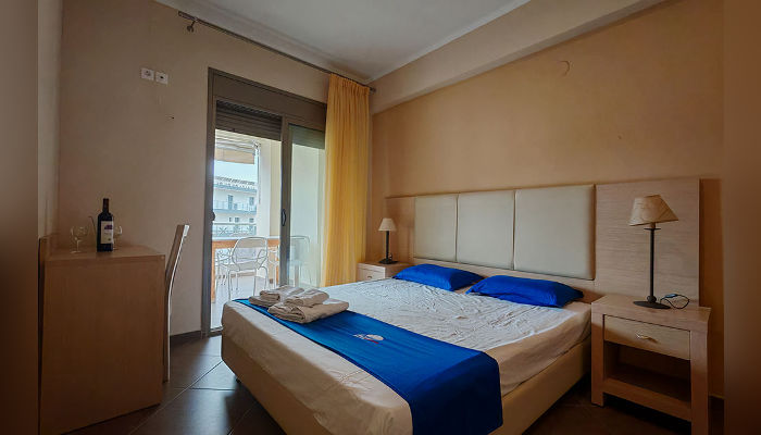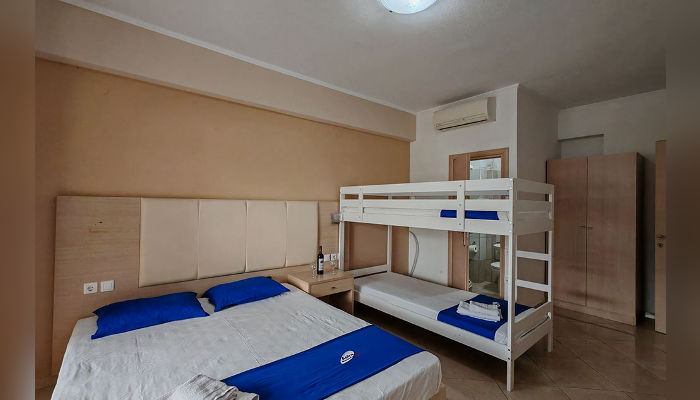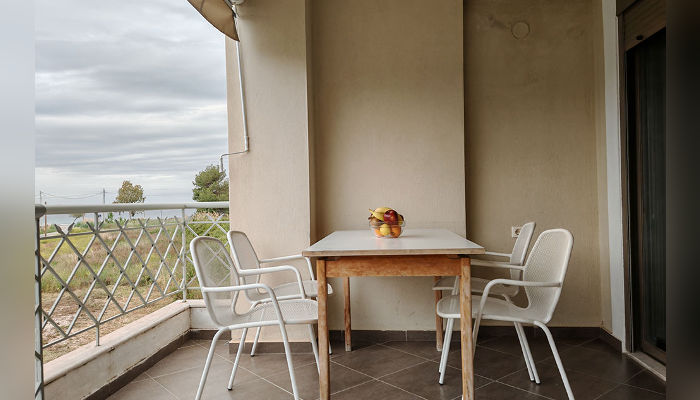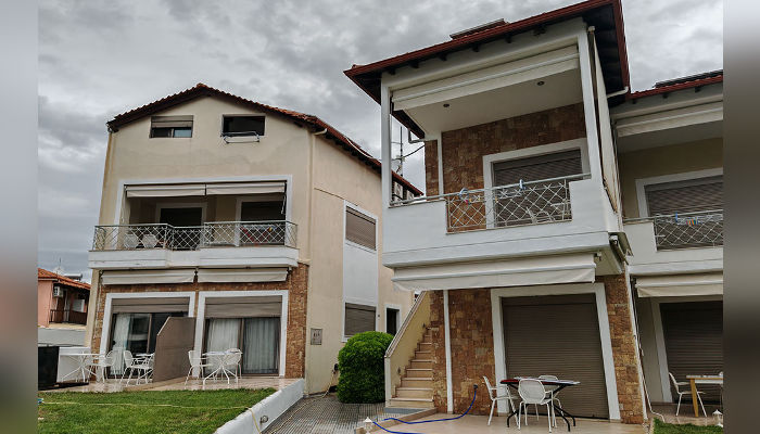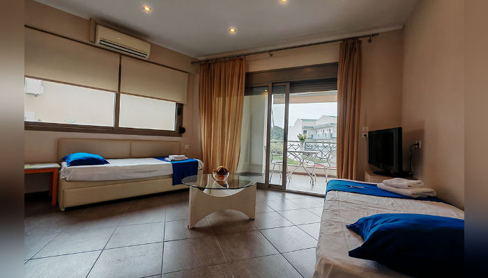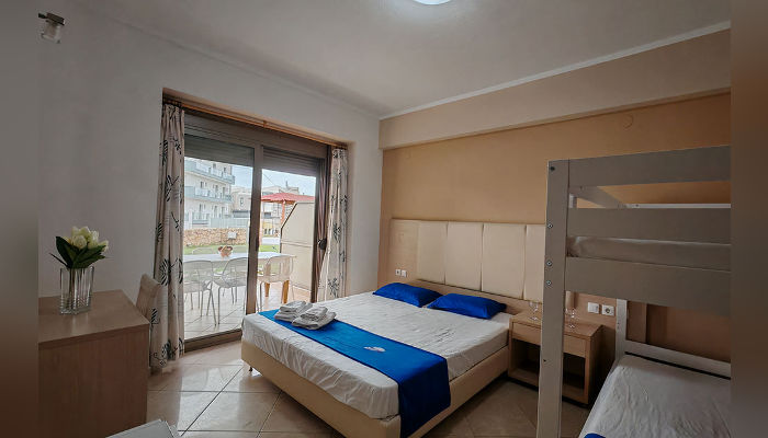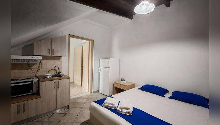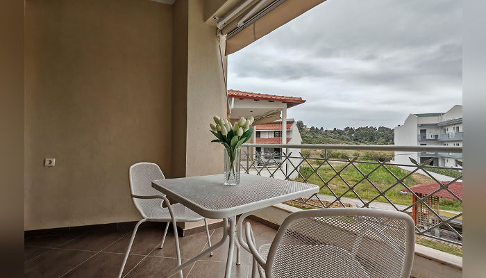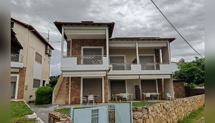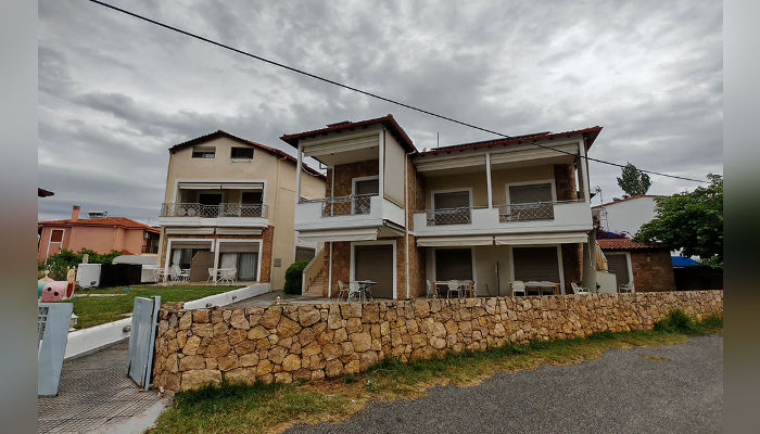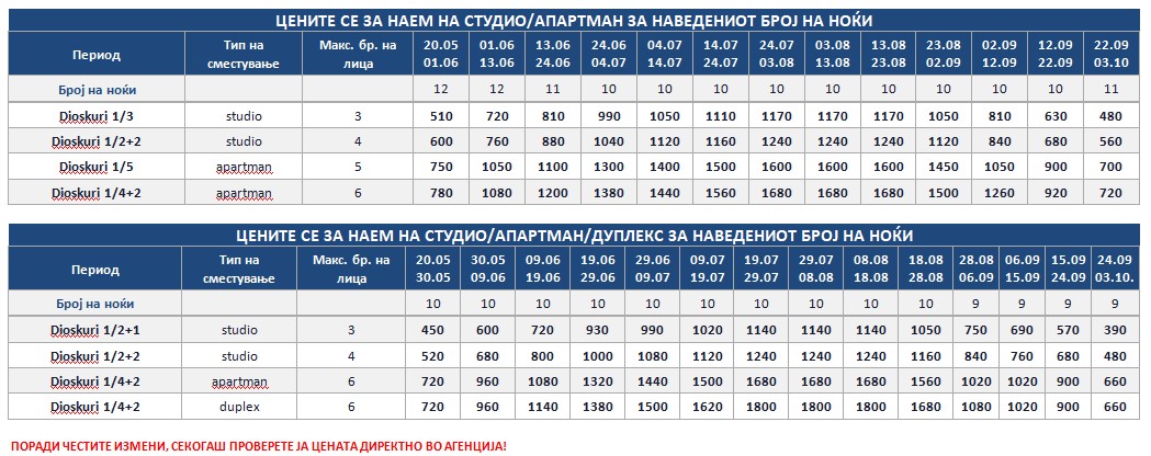 DIOSKURI – Куќата се наоѓа на околу 160 m oд Парадизос плажата и на окoлу 800 м од центарот на Неос Мармарас. Студијата, апартманите и дуплексите се наоѓаат на приземје и на прв кат. Сите имаат SAT TV, бежичен интернет за чија брзина и проток агенцијата не може да гарантира, комарници, пешкири и клима вклучена во цената. Терасите се пространи. Објектот има двор со помал простор уреден за разонода на децата. Пред куќата постои неограден простор за паркирање. При замената на постелнина на половина од смената организирано е и чистење на сместувачката единица.
