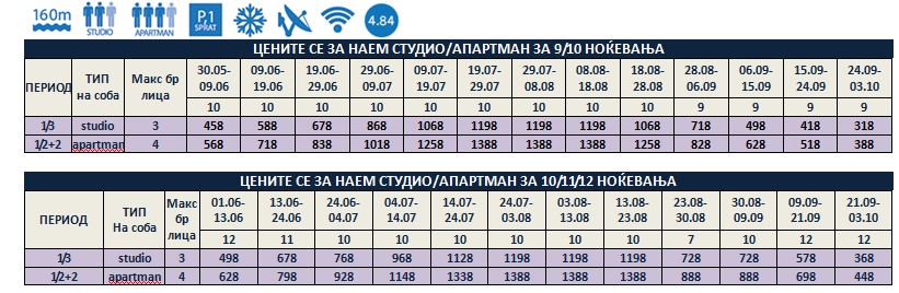 – за комплетна уплата со резервација за престој во термините со почеток од 20.05. – 12.06. и 28.08. – 24.09., се одобрува попуст од 50% на цената на наемот за избраното сместување