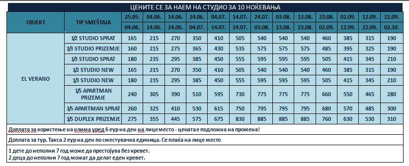 Такса за престој, во висина од 2 евра по сместувачка единица на ден се плаќа на лице место, на претставникот или сопствениците на објектот и не подлежи на попусти!