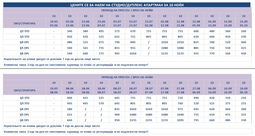 Такса за престој, во висина од 2 еврa по сместувачка единица на ден се плаќа во агенција со резервација и не подлежи на попусти!