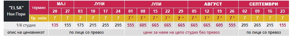 – Доплата за клима – 7€ од ден (се плаќа на лице место);