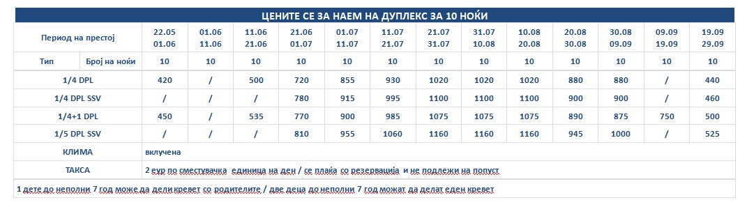 Такса за престој, во висина од 2 еврa по сместувачка единица на ден се плаќа во агенција со резервација и не подлежи на попусти!