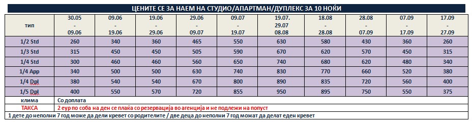 Такса за престој, во висина од 2 еврa по сместувачка единица на ден се плаќа во агенција со резервација и не подлежи на попусти!