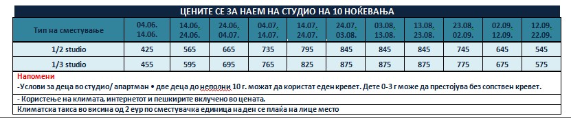 Такса за престој, во висина од 2 евро по сместувачка единица на ден се плаќа на лице место, на претставникот или сопствениците на објектот и не подлежи на попусти!