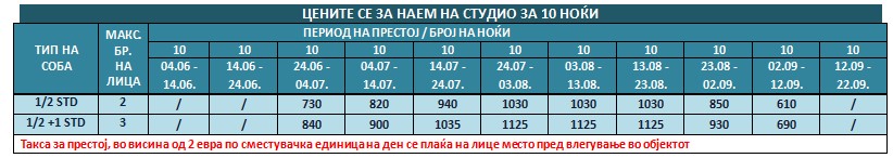 Такса за престој, во висина од 2 еврa по сместувачка единица на ден се плаќа на лице место пред влегување во објектот. Подлежи на измени!