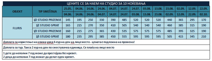 Такса за престој, во висина од 2 евра по сместувачка единица на ден се плаќа на лице место, на претставникот или сопствениците на објектот и не подлежи на попусти!