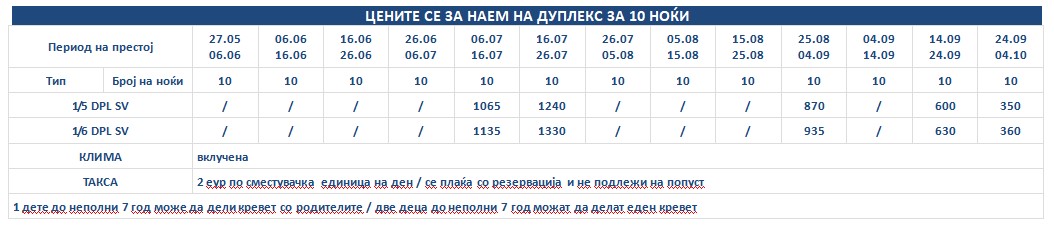 Такса за престој, во висина од 2 еврa по сместувачка единица на ден се плаќа во агенција со резервација и не подлежи на попусти!