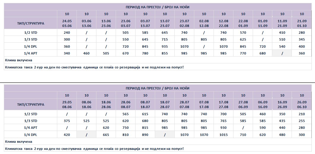 Такса за престој, во висина од 2 еврa по сместувачка единица на ден се плаќа во агенција со резервација и не подлежи на попусти!