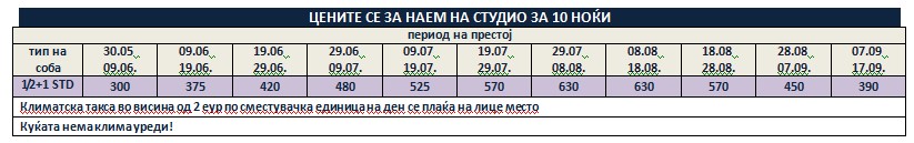 Такса за престој, во висина од 2 евра по сместувачка единица на ден се плаќа на лице место пред влегување во објектот. Подлежи на измени!